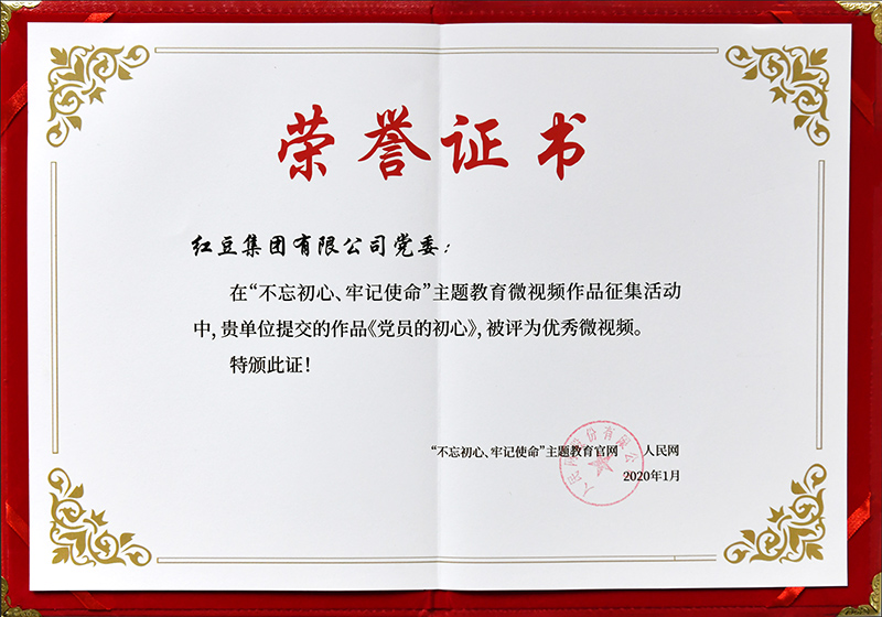 紅豆集團參評的《黨員的初心》,經(jīng)過專家評選,網(wǎng)絡(luò)投票,從全國4000多件作品中脫穎而出,被評為50個“優(yōu)秀微視頻”作品之一,紅豆集團也是全國唯一一家民營企業(yè)獲得此項殊榮。