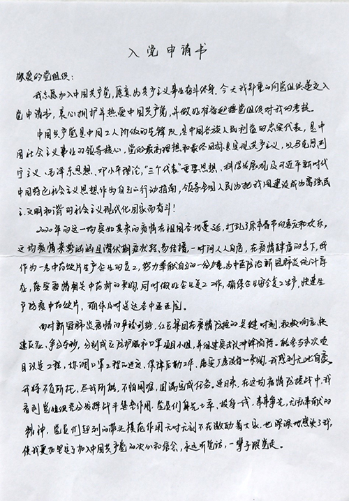 紅豆集團國際公司的員工梁艷的再次向黨組織遞交入黨申請書的原因很簡單,“為了支持一線疫情防控,集團緊急組建黨員突擊隊支援防護服、口罩生產(chǎn)線,負責(zé)最緊急、最艱苦的工作。我也報名了,因我還不是黨員,所以沒有把最重的任務(wù)安排給我?!笔艿缴磉咟h員的激勵,讓梁艷鼓起勇氣,擬出了這份“疫情火線入黨申請書”。