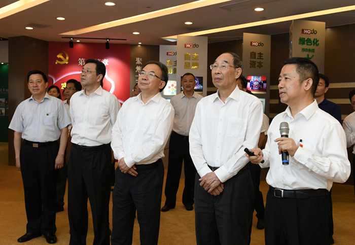 7月10日,中共中央書記處書記、中央統(tǒng)戰(zhàn)部部長尤權(quán)來錫,深入民營企業(yè)調(diào)研非公經(jīng)濟發(fā)展情況。他強調(diào),要堅持以習近平新時代中國特色社會主義思想為指引,把鼓勵、支持、引導(dǎo)民營經(jīng)濟發(fā)展的政策落地落實,促進非公有制經(jīng)濟持續(xù)健康發(fā)展。省委常委、省委統(tǒng)戰(zhàn)部部長楊岳,省委常委、市委書記李小敏參加調(diào)研。當日下午,尤權(quán)來到紅豆集團,先后參觀了紅豆黨建館、紅豆男裝智慧門店、紅豆工業(yè)城、紅豆杉盆景育苗大棚等地。在紅豆黨建館,紅豆集團黨委書記、董事局主席兼CEO周海江向尤權(quán)介紹了紅豆創(chuàng)立現(xiàn)代企業(yè)制度+企業(yè)黨建+社會責任“三位一體”的中國特色現(xiàn)代企業(yè)制度,及企業(yè)黨建成果、企業(yè)發(fā)展等情況。
