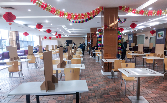 兵馬未動糧草先行。在復(fù)工之前,公司利用現(xiàn)有資源通過各種渠道采購了大量口罩,防護服、酒精、消毒液等防疫物資也已全部到位。公司食堂實行人員錯峰分流措施,員工就餐分時分批、限時限流,避免人員在食堂中聚集,進食堂前需檢測體溫,排隊取餐需間隔一米,每桌限坐2人,中間用板隔開,且一律同向而坐,避免隔桌交談。