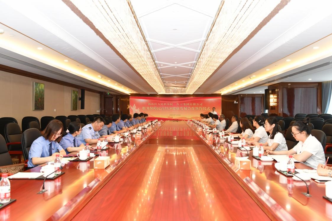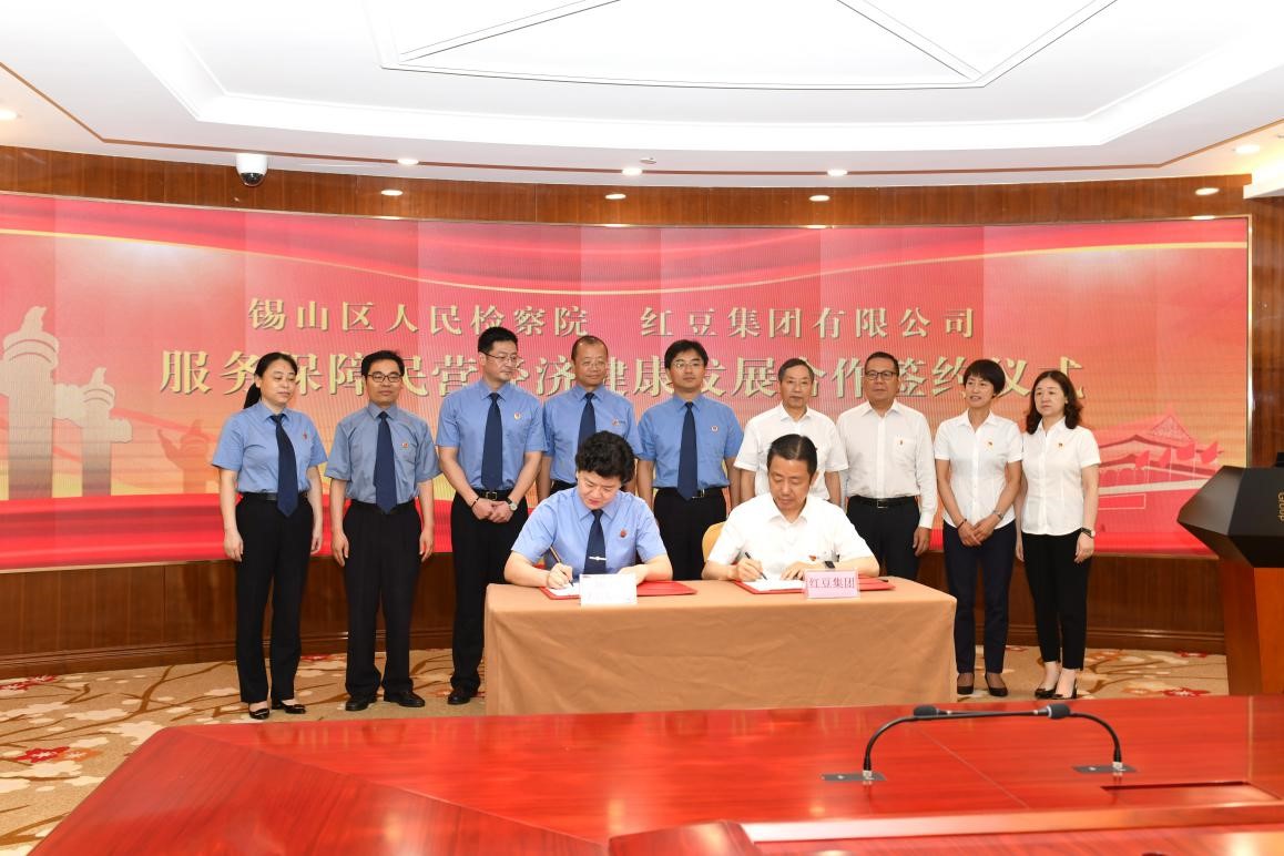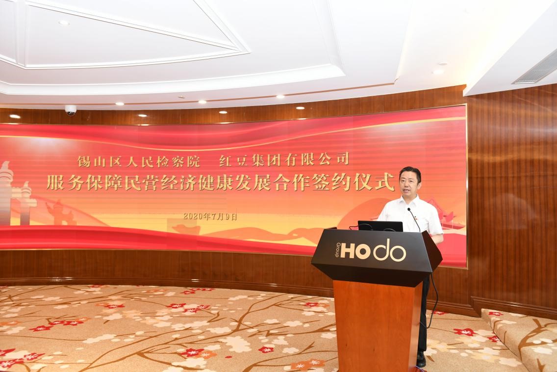 為深入貫徹習(xí)近平總書記在民營企業(yè)座談會上的重要講話精神,落實(shí)中央、省市委關(guān)于大力支持民營經(jīng)濟(jì)發(fā)展部署要求,充分發(fā)揮檢察機(jī)關(guān)職能,為民營經(jīng)濟(jì)提供優(yōu)質(zhì)的法律服務(wù)和堅(jiān)定的司法保障,7月9日,紅豆集團(tuán)與錫山區(qū)人民檢察院在紅豆財(cái)富廣場北京廳進(jìn)行服務(wù)保障民營企業(yè)健康發(fā)展合作備忘錄簽約。儀式上,紅豆集團(tuán)黨委書記、董事局主席兼CEO周海江和錫山區(qū)人民檢察院何瑩檢察長代表雙方簽署合約。