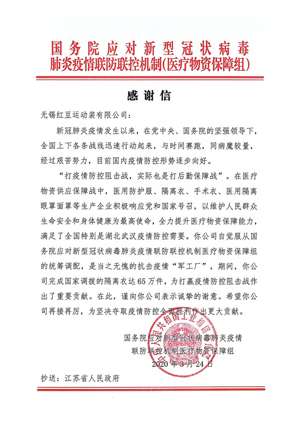 這是3月24日,紅豆集團下屬的紅豆運動裝公司收到國務院應對新型冠狀病毒肺炎疫情聯(lián)防聯(lián)控機制醫(yī)療物資保障組的感謝信中的一段話。